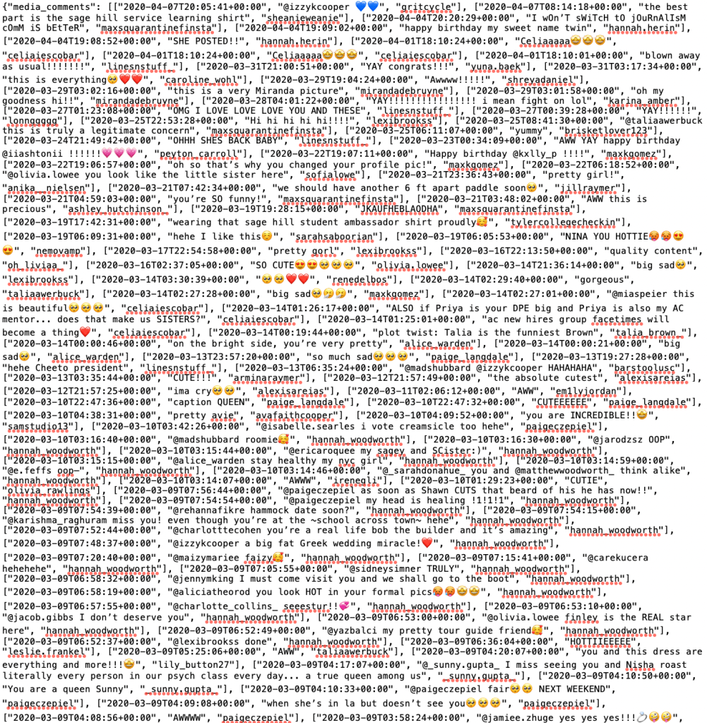 For a few years now, I have been interested in learning more about data security, so I was excited to spend time analyzing my own data. In terms of social media, I predominately use Snapchat and Instagram, but have recently started getting into Facebook and Tiktok during the quarantine. Because I have had Instagram the longest, I decided to download my data from there. I started to sort through the information, looking through the main folders labeled ‘direct’, ‘photos’, ‘profile’, ‘stories’, and ‘videos’. As I sifted through, the information I found most shocking was the comment history. I was able to see every comment I have ever made on an Instagram post since I downloaded the app in 2015. This was eye-opening because I always knew that social media platforms tracked what I did on their apps, but actually seeing all of the comments I have ever made in front of me highlighted the potential danger of these social media platforms.